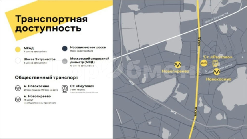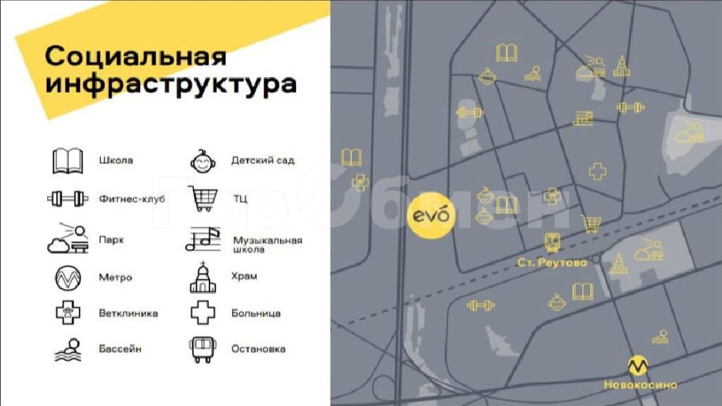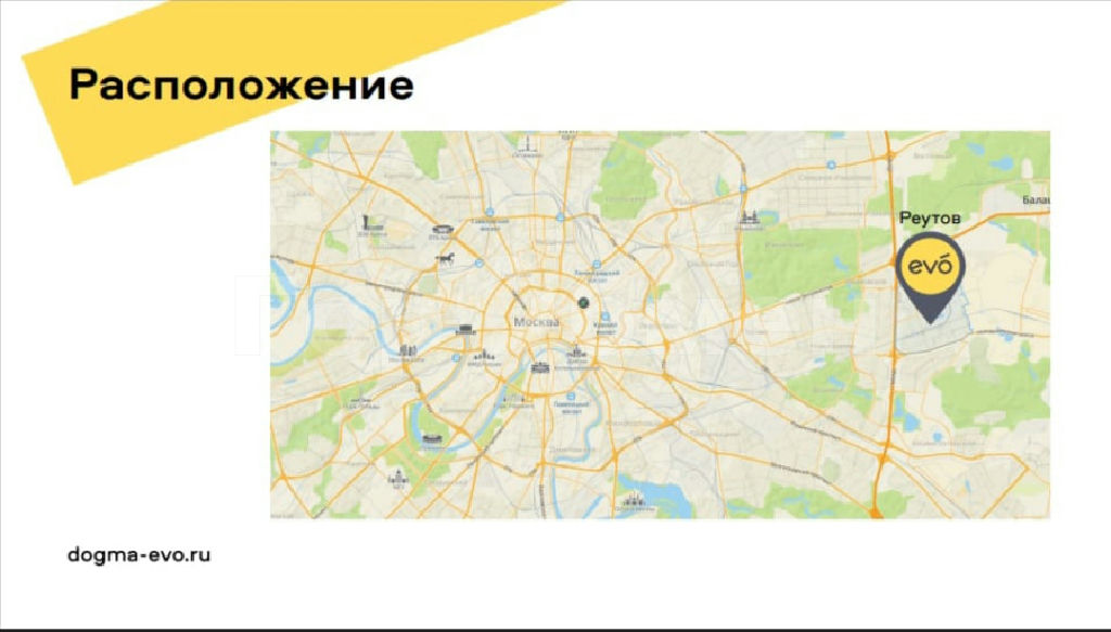 EVO расположен в городе Реутов, на границе с Москвой. В 7 минутах ходьбы находится станция Реутово, которая станет частью МЦД-4 до конца 2023 года. Уже сейчас от EVO за 20 минут можно дойти до метро "Новокосино". Для автомобилистов есть удобный выезд на МКАД и Шоссе Энтузиастов.